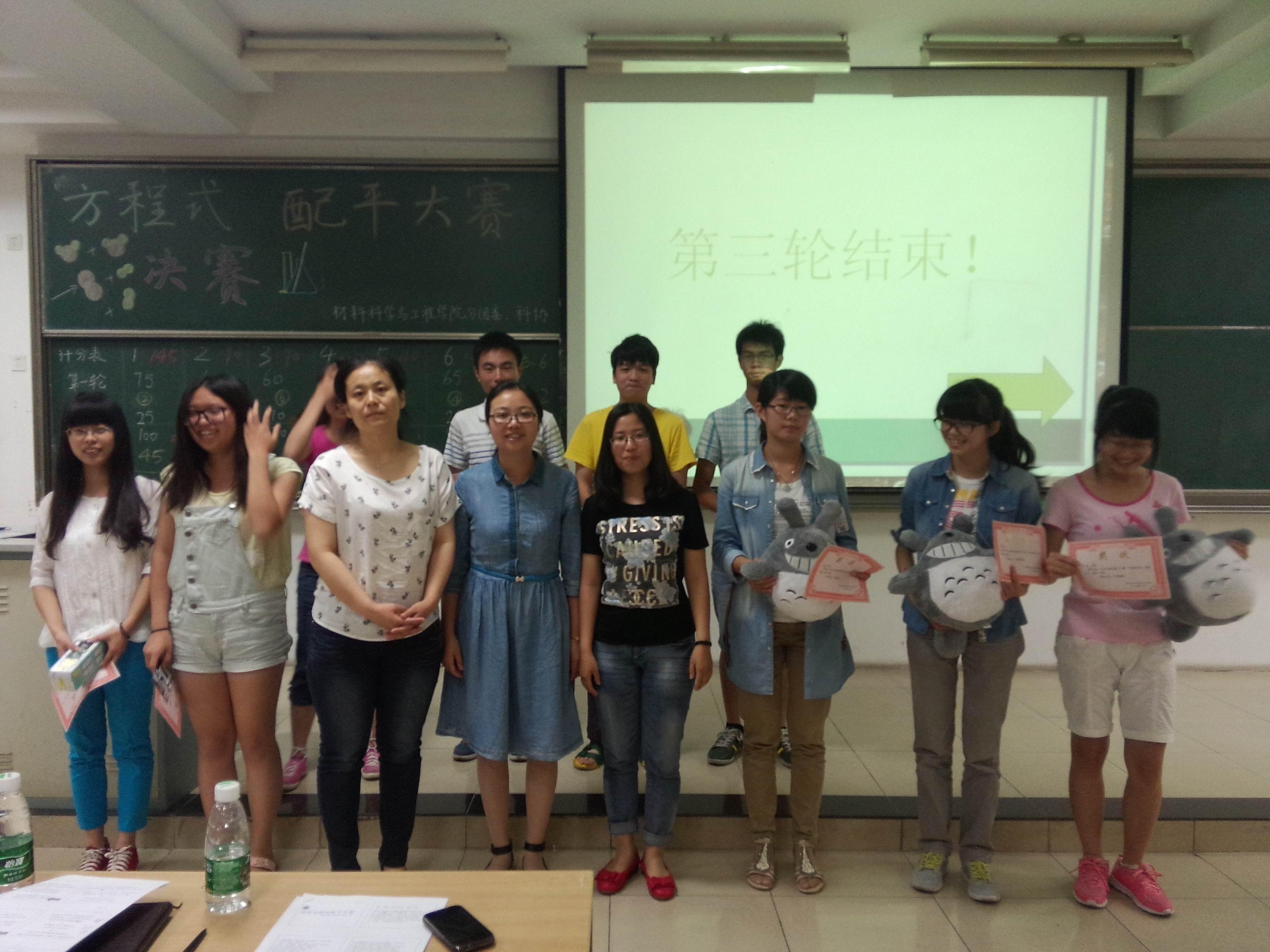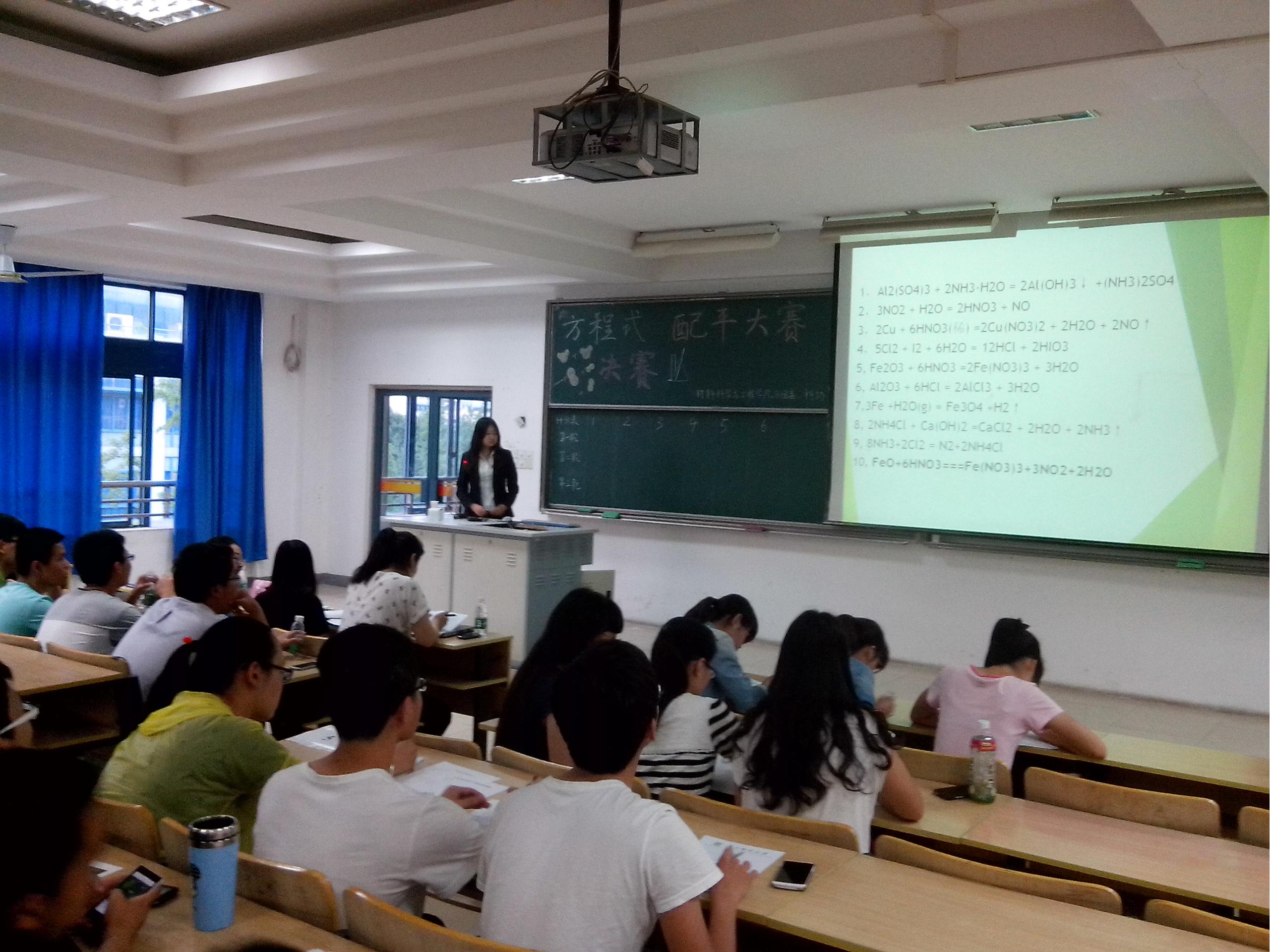 2014年6月5日晚,集知识性、趣味性于一体的“化学方程式配平大赛”决赛在教三402室成功举办。出席此次决赛的嘉宾有材料院分团委书记乔祖琴老师,材料院教师薛伟和郑超老师,以及材料院各个社团主席。此次比赛由腐漫画 科协承办,旨在推广化学基础知识,提高学生团队合作能力,培养同学们的科学素养,使同学们在快乐中汲取知识,给全校对化学感兴趣的同学们一个展现自己的平台。