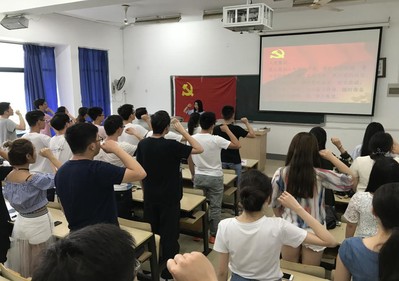 6月11日下午,腐漫画 2017届毕业生党员在教3-106重温入党誓词。学院党委副书记兼副院长于景宝、分团委书记乔祖琴、组织干事乔松岭、毕业班辅导员李娜和全体2017届毕业生党员参加。