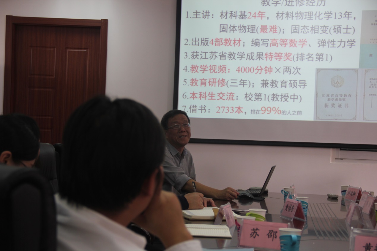 吴锵教授先做了自我介绍,讲述了他已经在南京理工大学主讲《材料科学基础》24年、《材料物理化学》13年,还教授《固体物理》以及研究生的课程《固体相变》,到目前为止已经出版了4部教材,参与编写了《高等数学》、《弹性力学》等书籍,获得江苏省教学成果特等奖(排名第一),录制教学视频8000分钟,进行了为期3年的教育研修,并同时兼职教育导师,平时注重与本科生的交流,这是其他教授很少做的事情,借书量高达2733本,超过了99%的人。
