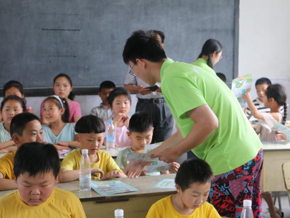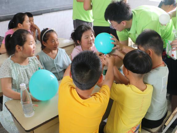 实践团的同学们为孩子们带来了一场关于“垃圾分类”的环保讲座。同学们向孩子送上精心设计的环保单页,在与孩子们的互动中教会孩子区分“干垃圾”、“湿垃圾”、“有害垃圾”和“可回收垃圾”,并结合专业知识特点带领孩子开展趣味化学实验。实践团的成员们分成若干小组,走下讲台,协助孩子共同完成实验。