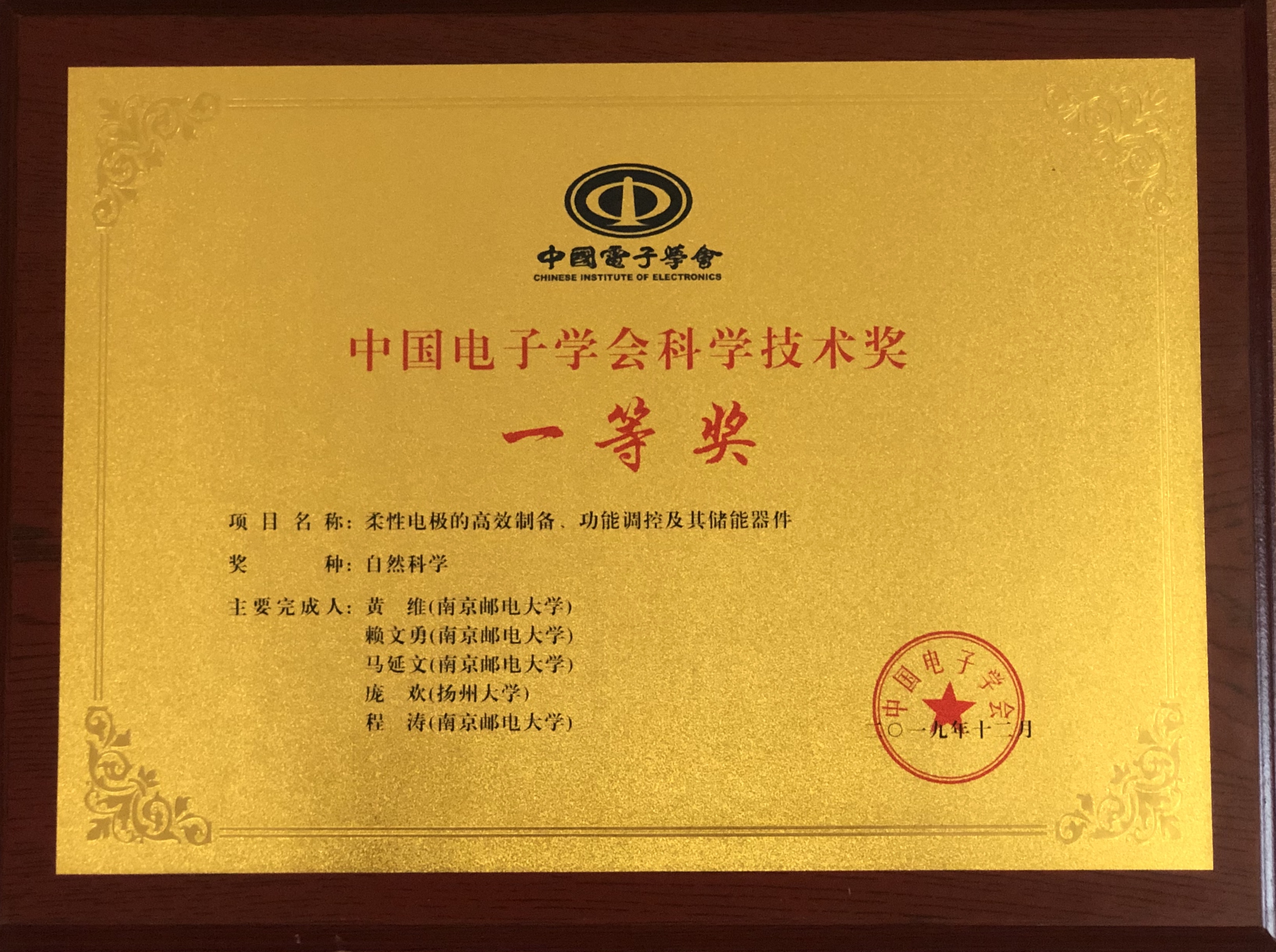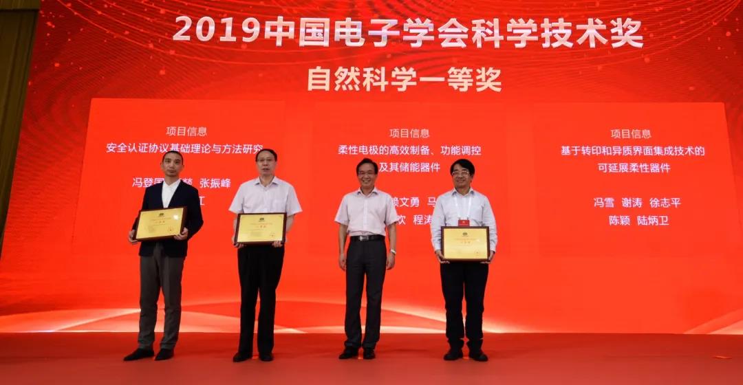 2020年8月15日,2019年度中国电子学会科学技术奖励大会在北京举行。由中国科学院院士、信息材料与纳米技术研究院院长黄维院士领衔的“柔性电极的高效制备、功能调控及其储能器件”项目获得中国电子学会科学技术奖自然科学一等奖。