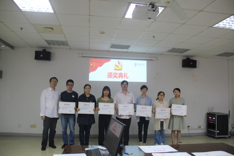 表彰会在国歌声中开始。张建平副书记宣读了表彰名单,王思远等8位同志被评为优秀教师共产党员、王炯等15位同志被评为优秀大学生党员、宋春元同志为被评为优秀党务工作者、实验中心党支部被评为先进党支部。