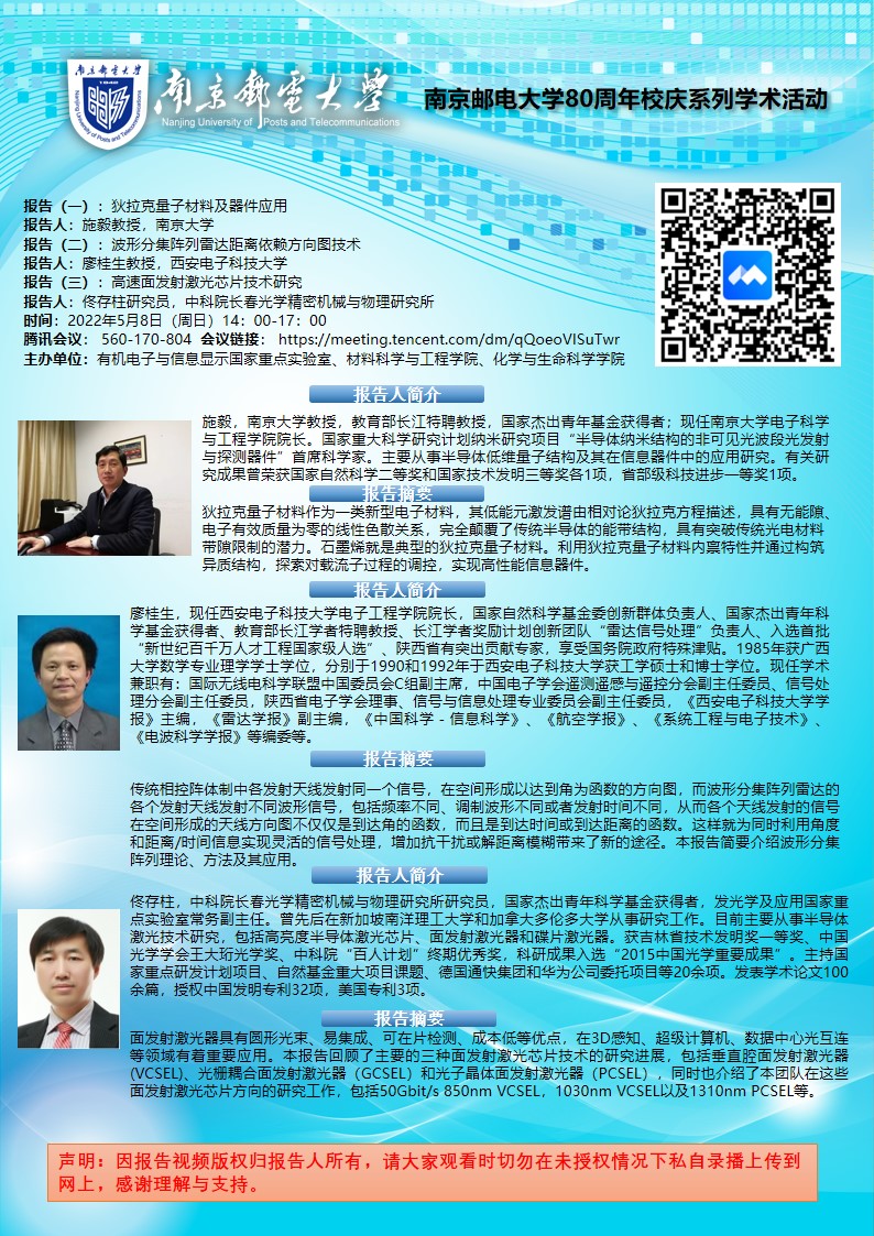 南京大学施毅教授&西安电子科技大学廖桂生教授&中科院长春光机所佟存柱研究员学术报告