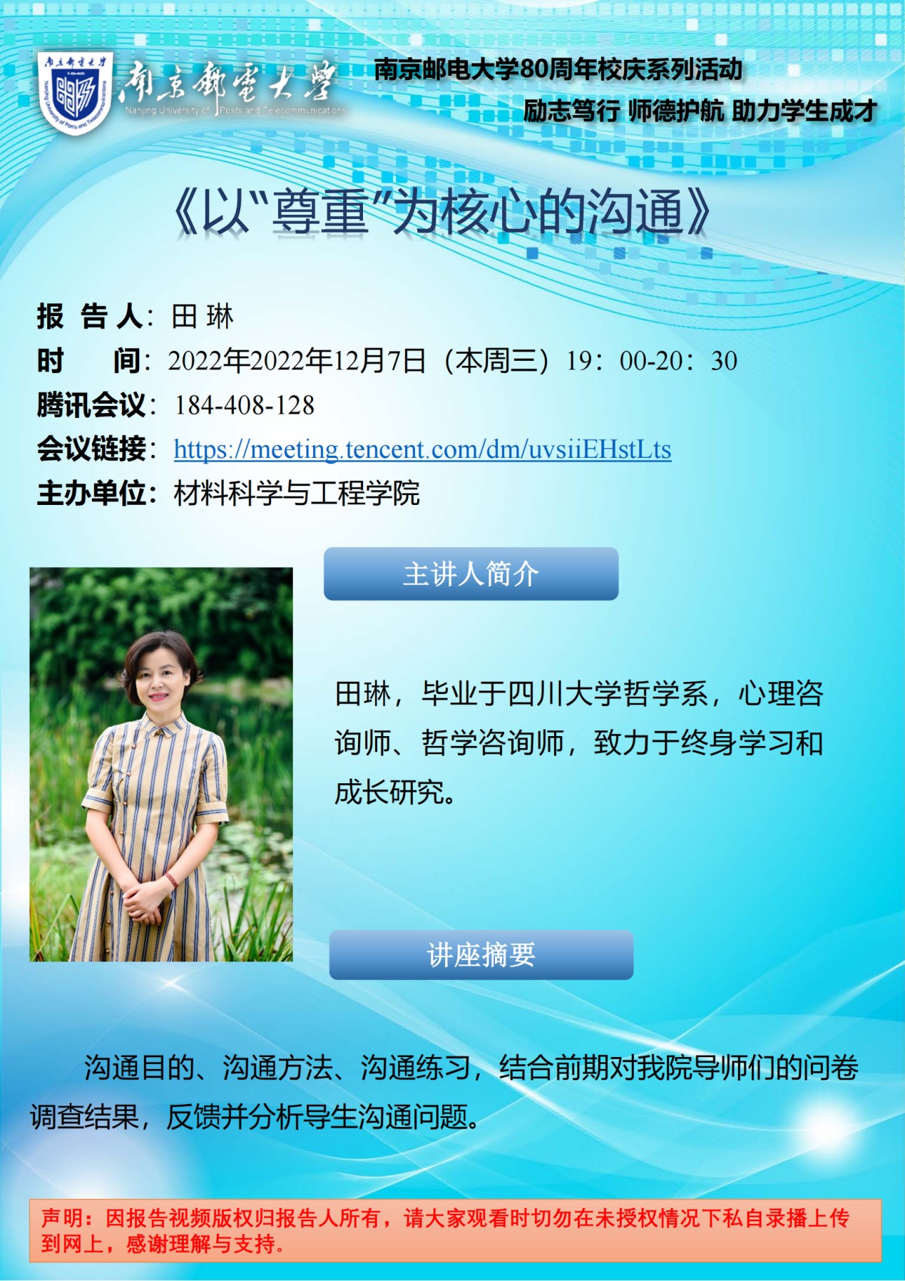 12月7日,腐漫画 分工会举行题为《以“尊重”为核心的沟通》的导师关系专题讲座。讲座由心理咨询师、哲学咨询师田琳老师主讲,以腾讯会议方式开展。