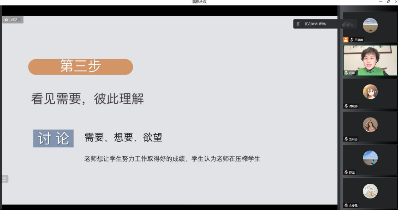 讲座的尾声,与会老师和主讲人就指导学生的具体沟通问题,做练习和互动,田琳老师指出,这些沟通技巧是基于“人与人是相互依存的”、“与人协作而不强迫”的意识来运用,目的是使人友爱互助,她希望能够帮助师生在指导和交流的过程中,带来被彼此更加理解的语言和行为输出,实现育人效果的改进。参会老师认为,学会沟通可以促进师生的科研和学习协作,非暴力沟通的方法需要在实际工作场景中加以练习和理解,方能增进师生关系,达到“润物细无声”的作用。