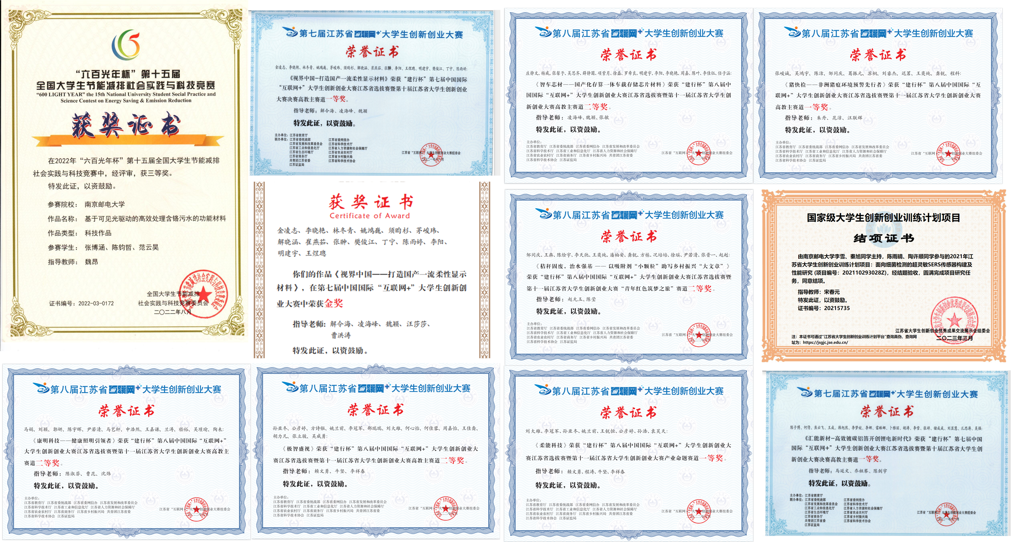 通过实验实践教学理念与体系创新、教学内容和教学手段的创新,取得了很好的实验实践教学成果和成效,近两年荣获全国“互联网+大赛”金奖4项,铜奖1项,省一等奖4项,二等奖4项,中国国际大学生创新大赛(2023)国赛金奖2项;近五年来,全国“挑战杯”竞赛获国奖6项,省级获奖4项,2022年“挑战杯”江苏省大学生创业计划竞赛获金奖1项,银奖1项,国赛获银奖2项,助力学校首次捧得“挑战杯”创业计划竞赛国赛“优胜杯”,2023年在第十八届“挑战杯”国赛上取得新突破,腐漫画 共获得全国一等奖1项、全国三等奖1项;获全国大学生节能减排大赛全国一等奖1项,二等奖1项,三等奖4项。近五年承担了STITIP国家级项目16项,省级项目17项。