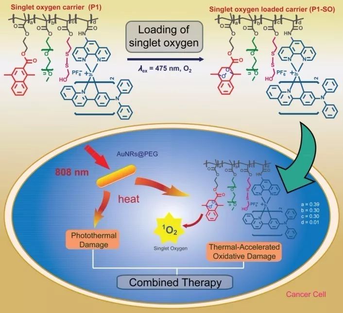 最近,腐漫画 IAM团队赵强教授和黄维院士领导的研究小组研制了一种水溶性的聚合物1O2载体,能够将体外产生的1O2运输到癌细胞中,造成癌细胞的氧化损伤,并且不需要消耗细胞中的O2,为解决上述问题提供了新思路。该聚合物(P1)主要由铱配合物、1,4-二甲基萘的衍生物(DMN)和水溶性PEG链通过自由基聚合反应得到。其中铱(III)配合物能够作为光敏剂产生1O2,紧接着产生的1O2会被DMN捕获并储存,从而得到了负载1O2的聚合物P1-SO。通过对P1-SO加热则能够释放1O2。为了在癌细胞中有效地释放1O2,他们将P1-SO和PEG修饰的金纳米棒(AuNRs@PEG)与癌细胞一起孵育,使其进入癌细胞。在808 nm的近红外光照射下,金纳米棒的光热效应不仅能够对癌细胞造成热损伤,还能够促进1O2的释放,对癌细胞造成氧化损伤,从而实现光热控制的治疗。这是第一例聚合物1O2载体用于光热控制肿瘤治疗的报道,使得1O2可像传统药物一样通过递送系统进入体内特定部位释放,从而对新型高效抗癌药物的研发具有重要的借鉴意义。