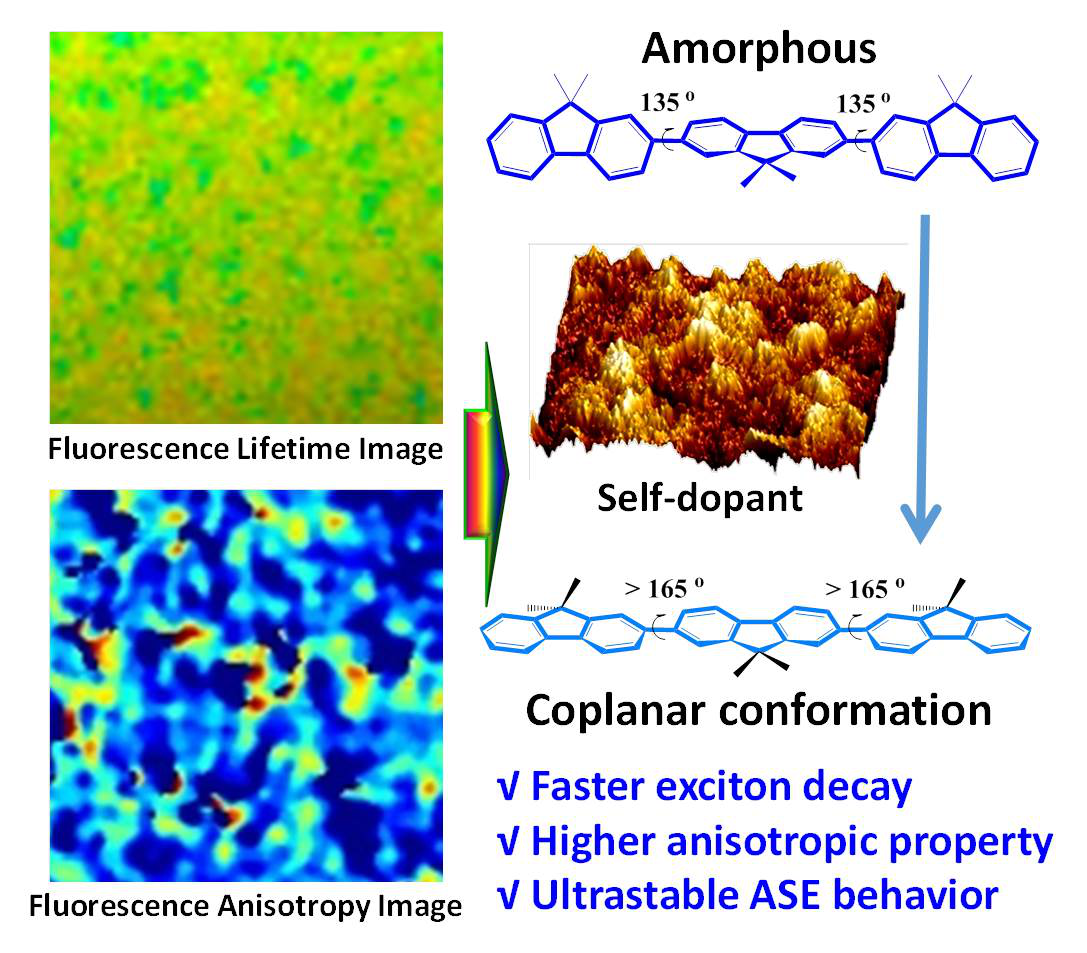 在塑料电子学中,一维线性共轭聚合物的定向电子离域行为,使其分子链构象是决定聚合物光电性能的重要因素。相比于其它分子构象,聚芴半导体的分子链共平面化构象,即β相,具有更长的有效共轭链长,使其呈现优异光电行为,如具有良好的光致/电致发光稳定性、较高的载流子迁移率和优异的发光器件性能、低的激光阈值,在过去二十年间成为聚芴半导体领域的研究重点。在总结前期工作的基础上,IAM团队黄维院士和林进义副教授团队发现经典的聚芴半导体材料—聚(9,9)二辛基芴(PFO)具有良好的共平面化能力,在1,2二氯乙烷(DCE)具有明显凝胶化聚集过程,可诱导分子链形成共平面化构象,决定溶液后加工的薄膜形貌,通过控制聚集过程,实现在旋涂原位薄膜上形成有序的β相聚集体纳米薄膜(Chinese Journal of Polymer Science, 2016, 11, 1311, ACS Applied Material Interfaces 2016, 8, 18969.)。然而,目前只有在PFO及其衍生物具有β相共平面化能力,称为第一代β相聚芴半导体,而第一代β相聚芴半导体易于聚集和易被空气氧化,限制其应用发展。在2014年,通过主链双侧不对称分子设计理念,开创了具有共面平化构象的第二代β相聚芴半导体(PODPF,Macromolecules 2014, 47 (3), 1001. ACS Applied Material Interfaces 2016, 8, 21648. The Journal of Physical Chemistry C 2017, 121 (35), 19087. Journal of Materials Chemistry C 2017, 5 (22), 5345-5355, Polymer, 2018, Accepted.)。基于前期的设计基础,在原有的共平面化构象聚二芳基芴主链引入不同的螺芴基团,在保证共平面化构象的基础上提高材料的光电特性。研究结果表明,位阻功能化的聚二芳基芴呈现高稳定性的电致光谱。经研究发现,基于螺芴氧杂蒽的聚二芳基芴在提高材料蓝光稳定性的同时,具有共平面化构象形成能力,呈现超低阈值的受激放大辐射效应(ACS Applied Materials & Interfaces, 2017, 9 (43), 37856.)。在此基础上,系统研究了聚芴无规和平面化构象的光物理和荧光各向异性行为。通过PFO和PODPF的β构象薄膜,探索构象转变对于其吸收和发射光谱,薄膜形貌,发射衰减行为和荧光各向异性的影响。通过荧光寿命成像(FLIM)测试中直接获取的二维图像验证了聚芴平面化构象的自掺杂薄膜,且其荧光衰减寿命均低于无规构象的薄膜,首次通过成像直观呈现聚芴半导体-β构象薄膜的自掺杂特性。此外,通过荧光各向异性成像(FAIM)表征显示β构象薄膜由于较高的分子链取向而呈现出较高的各向异性。本工作报道的FLIM和FAIM表征提供了一种有效的途径探索共轭聚合物构象转变的本征光物理过程。相关成果发表在Journal of Physical Chemistry Letters(Journal of Physical Chemistry Letters, 2018, 9, 364)杂志上,并被邀请做ACS liveslides展示。本系列工作得到IAM团队解令海教授、王建浦教授、仪明东教授和张新稳副教授以及澳大利亚墨尔本大学的Trevor教授的支持。第一作者分别为2016级博士研究生虞梦娜(Journal of Physical Chemistry Letters, 2018, 9, 364)和2017级博士研究生白鲁冰(ACS Applied Materials & Interfaces, 2017, 9 (43), 37856.)。