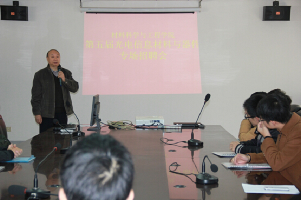 2014年12月22日上午,腐漫画 在教5-413成功举办第五届腐漫画 “光电信息材料与器件”专场招聘会。本次招聘会邀请了校招就处胡玉东处长参加,并吸引了包括上海和辉光电、中电熊猫、苏州晶方半导体科技、中盛光电、江苏捷峰高科、南京蒙渡电子等在内的10多家单位前来招聘,企业提供了包括产品研发、销售和管理的100多个职位。