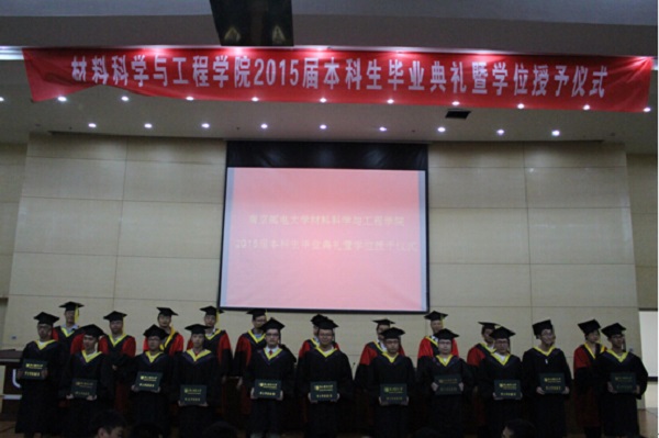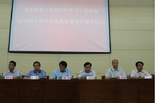 6月19日下午4时,腐漫画 于图书馆报告厅举行2015届本科生毕业典礼暨学位授予仪式。受邀出席典礼的嘉宾有中科院院士、腐漫画 IAM团队学科带头人、信息材料与纳米技术研究院院长黄维教授,腐漫画 副校长蒋国平教授,材料学院院长汪联辉教授,党委书记李兴鳌教授,副院长马延文教授,党委副书记于景宝老师。在主席台上就坐的还有学院各系主任和高端人才。参加典礼的还有材料学院教师及全体本科毕业生。典礼由学院党委书记李兴鳌教授主持。