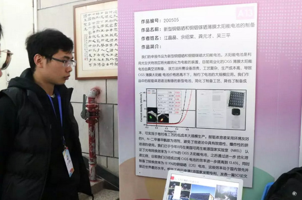 六个项目分别都获得了不错的成绩。新型铜铟硒和铜镓硒薄膜太阳能电池制备获得了发明制作类一等奖,可重复的绿色打印技术和虚拟仿真技术在SFX实验中的教学应用获得了发明制作类二等奖,燃料污水处理用木质素复合水凝胶的制备及研究获得了发明制作类三等奖,二硫化钼传感器平台用于恶性肿瘤早起检查获得了自然科学论文一等奖,增强单线态氧化率的近红外吸收BODIPY光敏剂用于高效的光动力治疗获得了自然科学论文三等奖,祝贺他们。