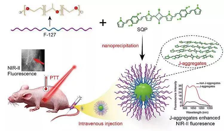 黄维院士、范曲立教授及其研究团队开发了一种新型的NIR-II荧光探针-方酸纳米粒子SQP-NPs(J) 。J-聚集是一种荧光分子“头-尾相连”的堆积方式,相对于常见的H-聚集,这种堆积方式具有更高强度的荧光。范曲立教授团队首先合成了一种具有近红外吸收能力的方酸,通过调控使方酸分子在组装过程中形成J-聚集。J-聚集的形成有效增强了方酸纳米粒子的NIR-II荧光强度,解决NIR-II荧光探针的荧光淬灭问题。同时,SQP-NPs(J)还具有光热治疗(PTT)的效果,可以在体内实现NIR-II荧光成像介导的光热治疗。