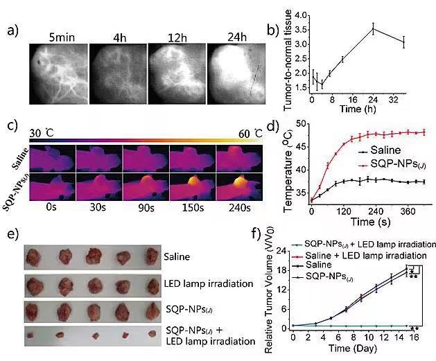 数据显示同一浓度下J-聚集型SQP-NPs(J) 的荧光强度比非J-聚集型的SQP-NPs(H)高4.8倍,证明调控分子的J-聚集可以起到增强其NIR-II荧光发射的效果。该结果也在活体小鼠内得到证明,实验结果表明J-聚集型的SQP-NPs(J) 在活体小鼠内成像的亮度更亮,清晰度更高。同时,该方酸纳米粒子的光热转换效率达到36%。NIR-II成像表明探针成功富集至肿瘤处,经过光热治疗后,小鼠肿瘤的生长成功抑制。