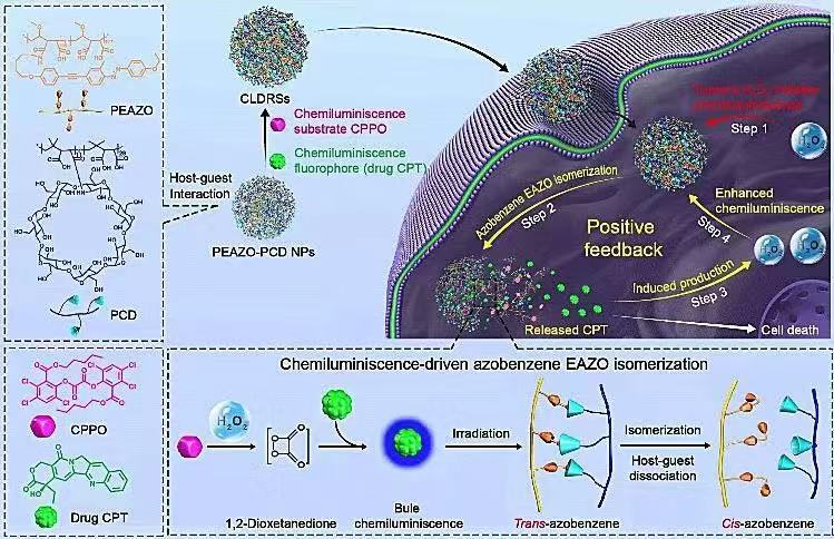近日,腐漫画 IAM团队范曲立教授团队在Chemical Science上发表文章,该团队人员利用靶向特异性启动和原位增强化学发光(自发光的一种)策略克服了缺乏靶向特异性高强度原位发光的局限性,实现了靶向特异性且组织深度无依赖的光致异构化。考虑到光致异构化在疾病特异性化疗的药物控制释放领域具有可观的应用前景,他们通过肿瘤特异性化学发光控制的药物化疗来阐述他们的原位发光驱动异构化策略的适用性。具体地,化学发光底物和化学发光荧光团(抗肿瘤药物,CPT)共同包封在由环糊精和低强度光异构化的偶氮苯组成的主-客体载体中。肿瘤组织高浓度过氧化氢诱导的化学发光初步启动偶氮苯异构化,引发主-客体载体的部分解离,从而导致CPT的初步释放。进一步地,最初释放的CPT在肿瘤组织原位诱导产生更高浓度的过氧化氢,实现了原位增强的化学发光,确保靶特异性增强的偶氮苯异构化和CPT释放。