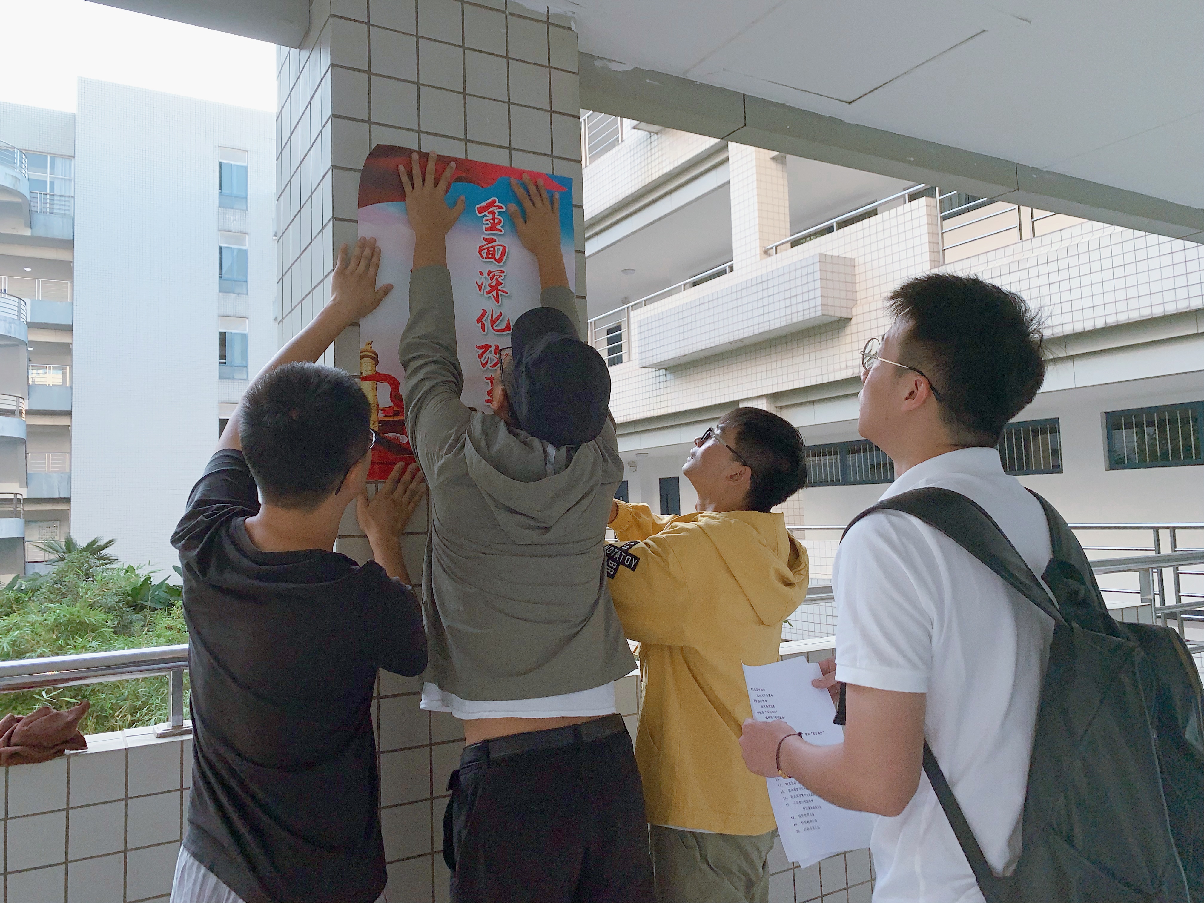 为确保张贴工作顺利有序进行,办公室党支部的党员同志们加班加点,连续奋战到深夜,与制作公司确定每一处细节,并特地用小纸条提前列出了每张海报不同的张贴位置,以确保张贴无误。活动当天,办公室党支部广泛发动学生党员、入党积极分子,早晨6:30到达学院,登梯爬高,仔细贴好每一块海报,确保每一张张贴位置符合要求,与学生党员、积极分子一起共同做好学科楼文化氛围的营造工作,最后在办公室全体党员和学院学生党员代表的共同努力下,材料院学科楼“不忘初心、牢记使命”主题教育氛围的布置工作圆满完成。