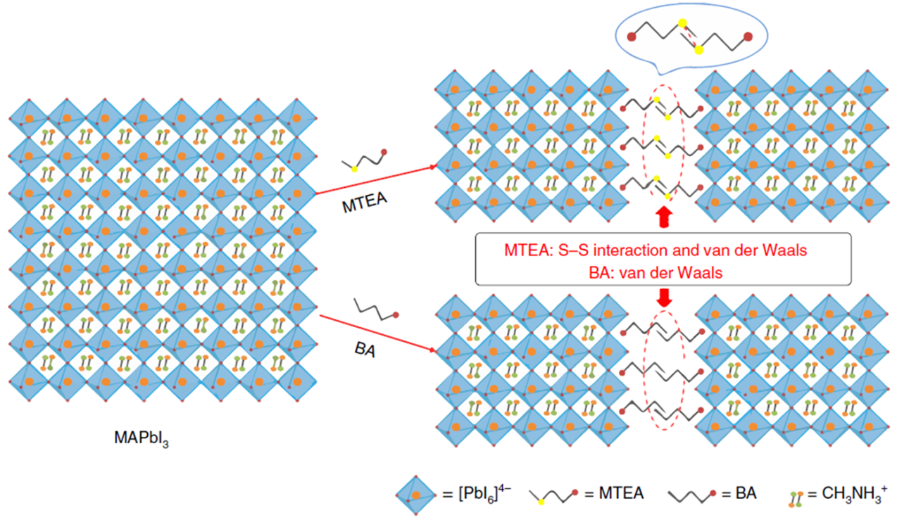 1,使用了一种新型的杂原子有机胺分子2–(硫代甲基)乙胺(MTEA)构建层状钙钛矿,通过钙钛矿层间MTEA分子之间S–S的相互作用,进一步稳定了层状钙钛矿骨架,制备了稳定性显著提升的钙钛矿薄膜,并且可以有效的增强层间电荷传输。