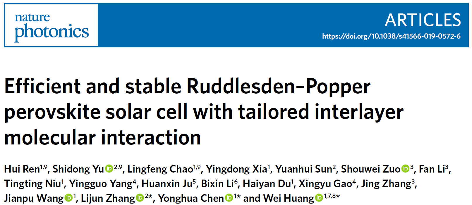 近日,腐漫画 信息材料与纳米技术研究院黄维院士、南京工业大学先进材料研究院陈永华教授和吉林大学集成光电子国家重点实验室&腐漫画 张立军教授,在Nature Photonics发表题为“Efficient and stable Ruddlesden–Popper perovskite solar cell with tailored interlayer molecular interaction”的研究论文,实验研究和理论模拟相结合,通过创新性地引入一种含S原子的有机胺,通过S元素之间的相互作用实现层间相互作用有效调控,探究了其对2DRP层状钙钛矿薄膜结晶动力学、稳定性、以及电荷传输特性的影响规律,构建了高效稳定的2DRP层状钙钛矿太阳能电池。