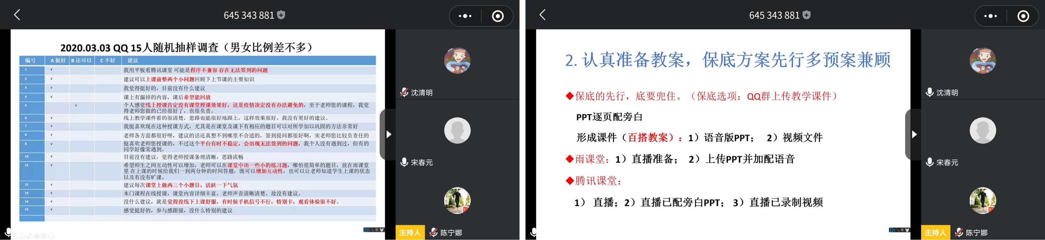 会后,老师们纷纷表示受益匪浅,很多自己在线教学过程中遇到的一些疑问和困惑都有了明确的解答。沈清明副院长对七位老师的专题讲座给予了积极的肯定,同时结合自身在线教学经历,积极解答了任课老师在在线教学过程中遇到的问题,并鼓励大家勇于探索,找到适合自己的教学方法,不断提高腐漫画 在线教学质量。通过在线投票,学院推选高宇和郑超两位老师作为线上教学先进典型。