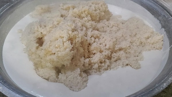 3. 和米:把打好的浆与蒸熟后的糯米混合成可以捏成型的状态。