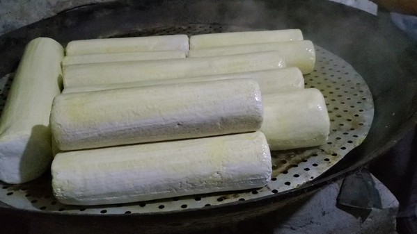 6. 上锅蒸粑粑:用蒸的方式,在上完浆,风干后的粑粑胚上抹上菜油。上锅蒸12小时左右即可出锅。