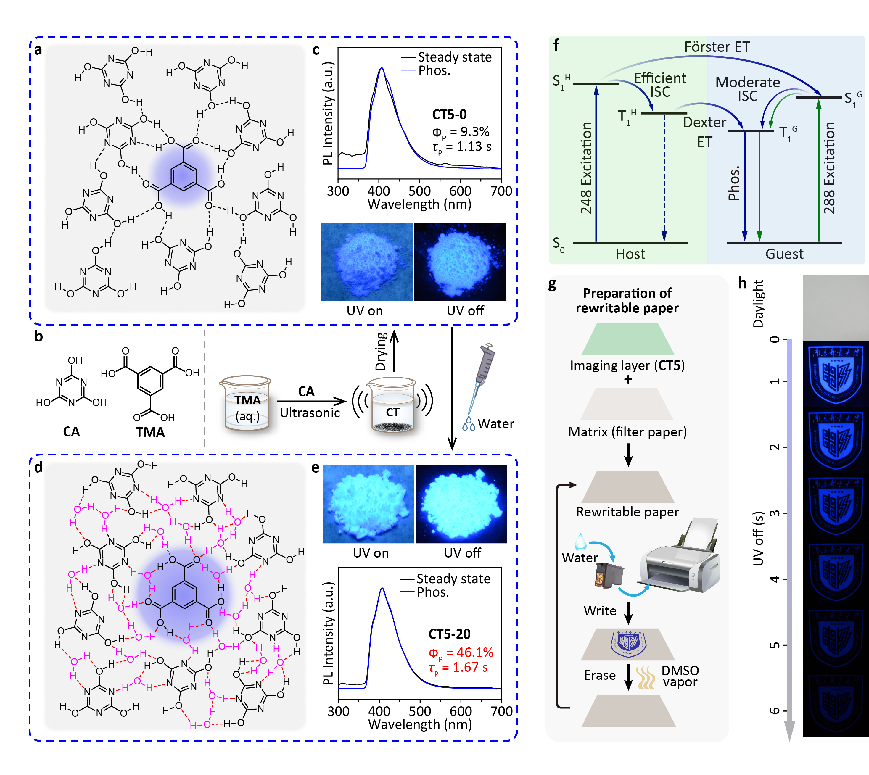 针对蓝光有机长余辉材料体系设计的固有困难,陈润锋教授提出了一种使用活性主体进行三重激发态敏化和用水进行基质固化的通用策略。主体材料氰尿酸(CA)和客体苯甲酸衍生物之间可以形成丰富的氢键作用,能够有效抑制发光猝灭和非辐射跃迁过程。且CA具有很强的自旋轨道耦合来产生三重态激子,并传输给客体增强发光亮度。将均苯三甲酸以5‰的质量比掺入CA中后,得到的混合物实现长达1.13 s的发光寿命和9.3%的磷光量子产率。加水后体系的氢键网络得到进一步加固,余辉寿命和磷光量子产率分别提高到1.67 s和46.1%,这是迄今为止报道的最佳有机长余辉性能之一。