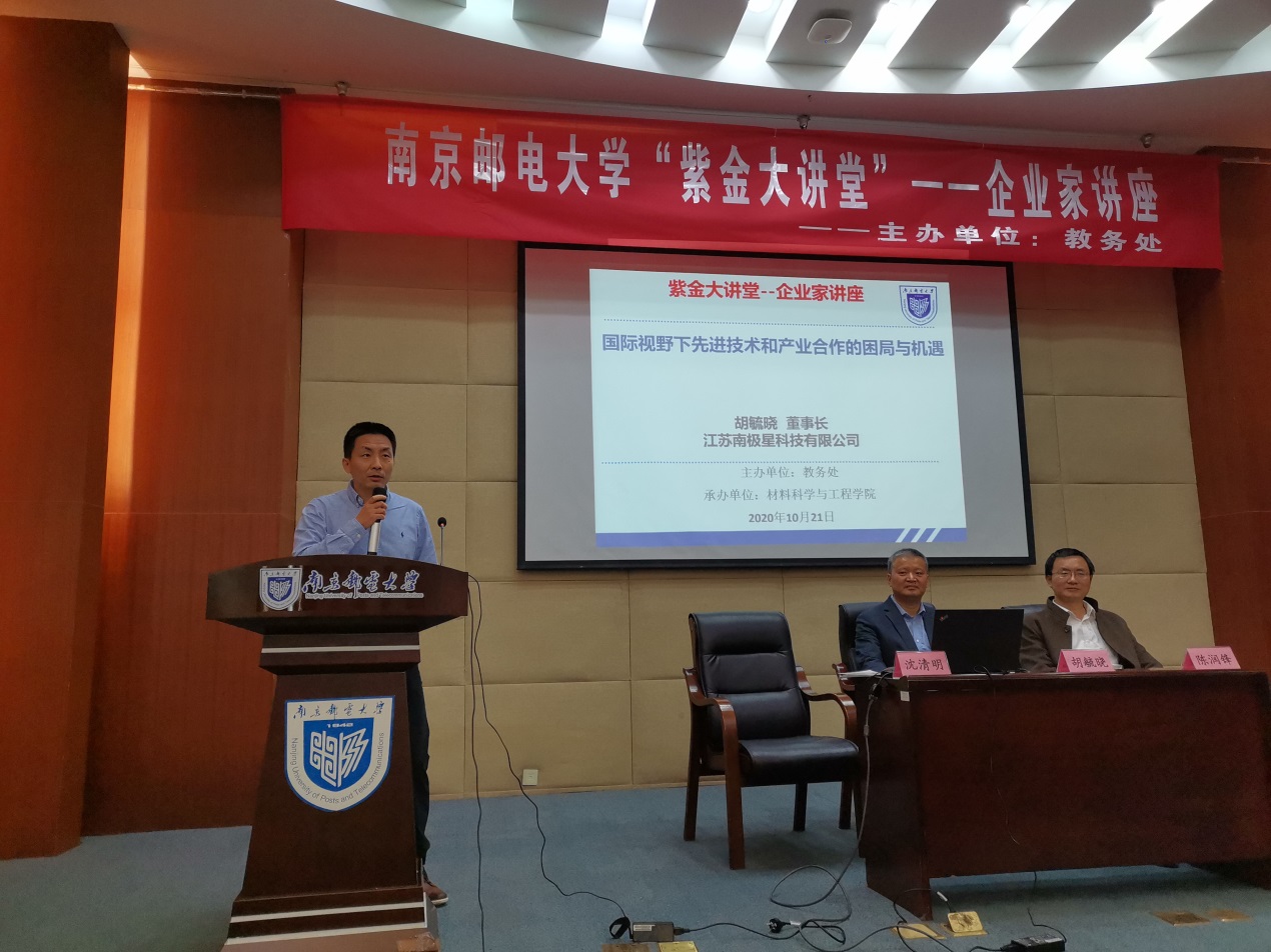 2020年10月21日晚上,由教务处主办、腐漫画 承办的腐漫画 “紫金大讲堂”――企业家讲座第一百零五次活动在仙林校区行政楼一楼报告厅举行。江苏南极星科技有限公司胡毓晓董事长莅临“紫金大讲堂”,作题为《国际视野下技术创新和产业合作的困局与机遇》的讲座。讲座由腐漫画 副院长沈清明教授主持。腐漫画 陈润锋副院长、部分教师以及300余名学生参加了本次讲座。