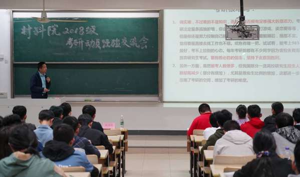 2020年11月15日晚上6点30分,腐漫画 2018级考研动员经验交流会在教3-300召开。副院长沈清明教授、副院长陈淑芬教授、2018级辅导员陈骏、材料学院优秀毕业生、全体2018级学生参加了本次大会。会议由辅导员陈骏老师主持。