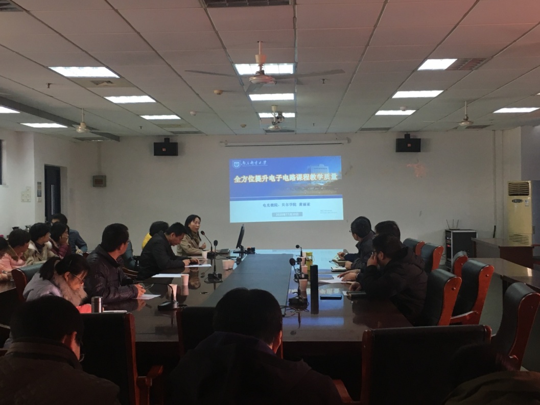随后,黄丽亚教授为两个专业的教师做了题为《全方位提升电子电路课程教学质量》的专题报告。报告分享了黄教授在MOOC制作,翻转课堂,雨课堂等课程建设及新型教学手段的应用经验,并介绍了小班化研究性教学的实施方案,通过启发式、探究式、小班制、促进学生自主学习,培养学生综合创新能力以及人格养成和诚信教育。通过过程化教学,增加单元测验的比重,强化过程评价等考核方式的改革,强化学习的全过程管理与质量评价。