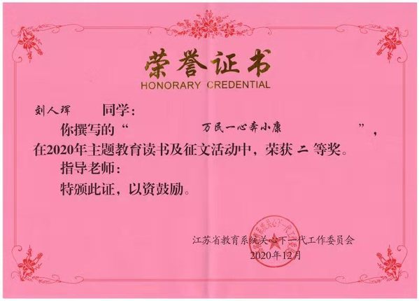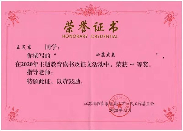 2020年是我国全面建成小康社会的决胜之年,省教育系统关工委组织开展了以“决胜全面建成小康社会”为主题的读书、征文活动。腐漫画 积极响应本次活动,并从众多稿件中仔细挑选了王昊东同学和刘人珲同学的文章代表腐漫画 参加此次征文比赛,经校关工委遴选脱颖而出,而后经省教育系统关工委专家组多轮评审,分别获得一二等奖,为院争光。