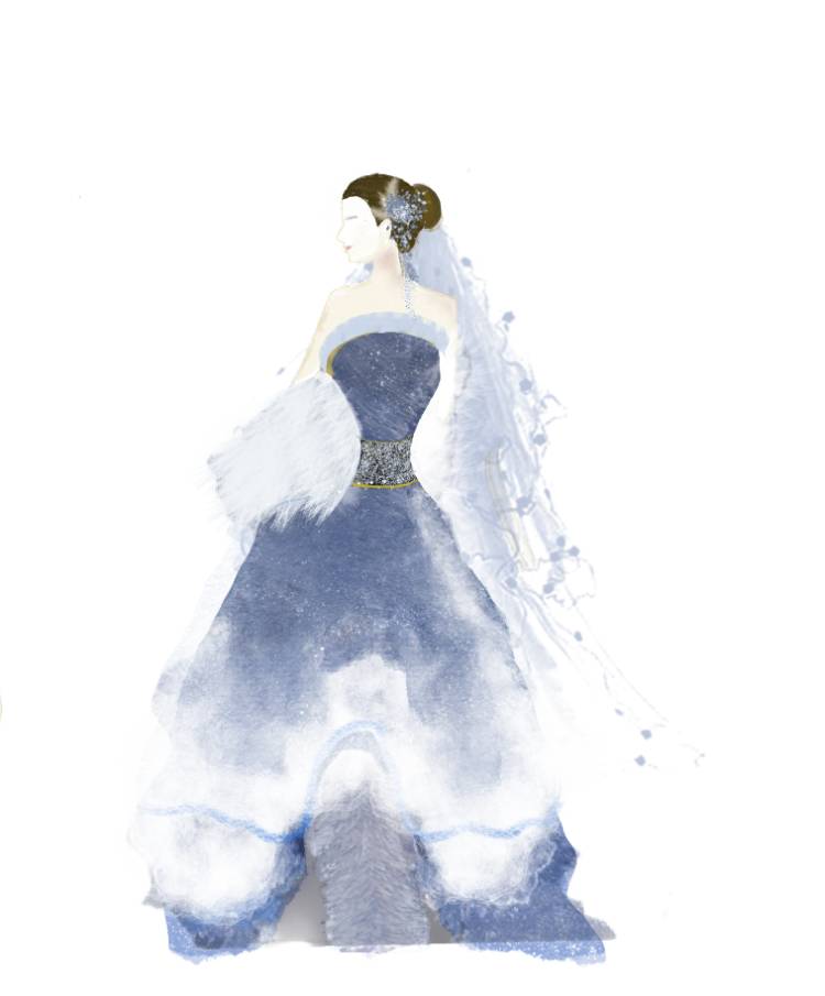 此作品原图取自美丽科学中的一幅图片,该图为电沉积生成的金属锌,选手依托该图展开了想象,将其幻化为一个穿着蓝色礼服的少女形象,将锌巧思为其裙摆发饰。