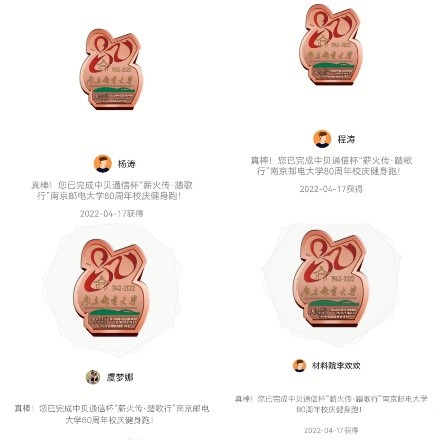 弦歌不辍,薪火相传。4月17日,腐漫画 分工会积极组织教职工参与校庆80周年健身跑活动。学院范曲立院长和赵允玉书记也双双带头参与了此次活动,号召大家积极参与健身跑活动。因疫情原因,虽不能亲临校园,教职工们以各种形式参与了当天的健身跑,参与人数达70人次。有些老师在校园内值守,在操场和校园内完成跑步。有些教职工居家办公,课余时间自行安排健身跑。学院分工会主席张建平和青年教师李平参加学校马拉松协会组织的80公里接力跑,共庆南邮80华诞。