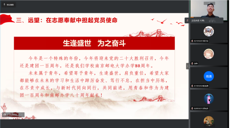 课程第一讲邀请了腐漫画 光学工程专业2020级硕士研究生、腐漫画 研究生会主席团成员、腐漫画 研究生三支部党支部书记付帅同学来分享他的故事。付帅同学现于共青团江苏省委社会联络部(志工部)协助工作。曾获美国大学生数学建模竞赛国家级二等奖、全国大学生节能减排社会实践与科技竞赛国家级三等奖、“挑战杯”全国大学生课外学术科技作品竞赛红色专项活动江苏省二等奖、“互联网+”大学生创新创业大赛江苏省三等奖等荣誉。他分享的主题是“青春心向党 奉献新时代”。