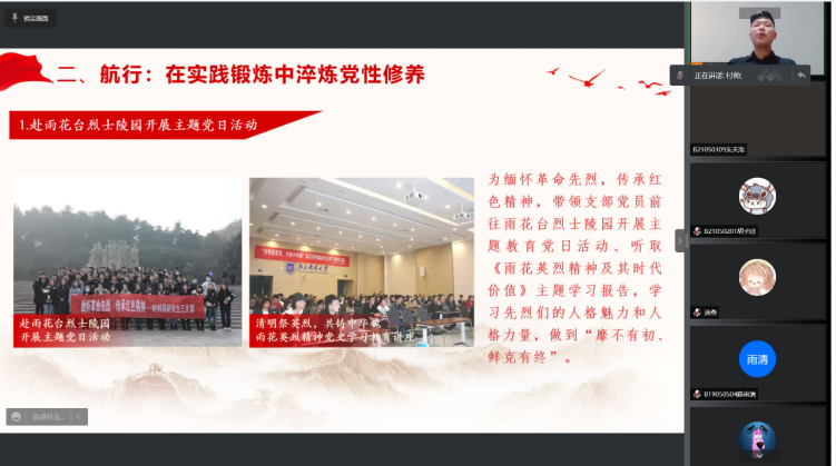 第二,在实践锻炼中淬炼党性修养,坚定了他跟随党的脚步。付帅曾赴雨花台烈士陵园、新四军纪念馆等革命之地开展主题党日活动,重温革命先辈的英烈事迹,从他的话语中,学子们也被先烈们的人格魅力和人格力量打动。在疫情期间,付帅也与支部党员们一同加入防疫志愿者队伍,肩负时代使命,为防疫工作贡献力量。
