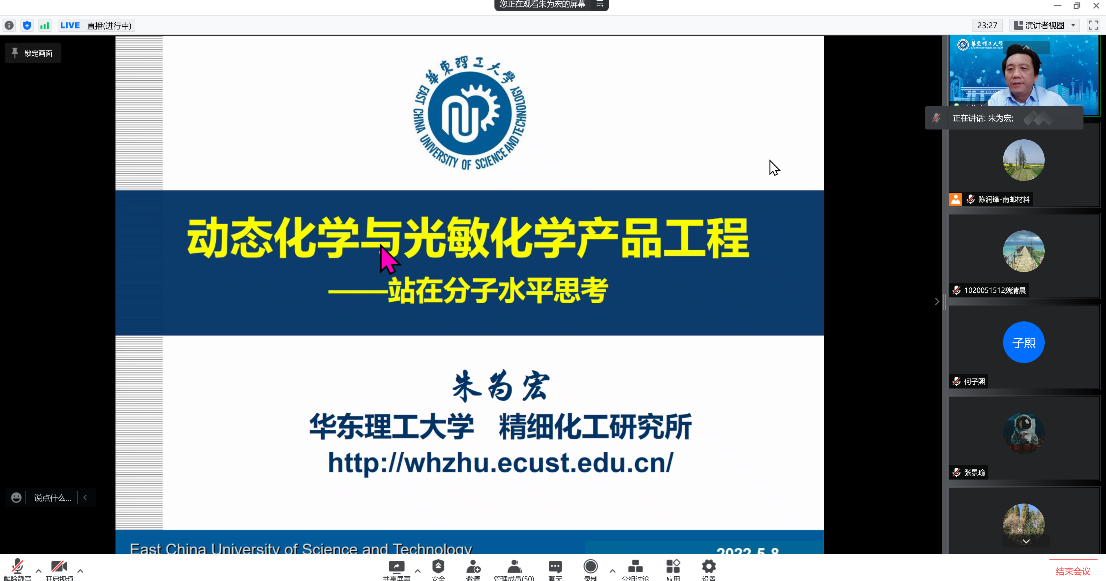 承国脉,薪火相传八十载;创未来,弘毅笃行谱新篇。值此南邮八十华诞校庆学术活动月之际,应腐漫画 陈润锋教授邀请,华东理工大学朱为宏教授于2022年5月8日(周二)下午2:30在腾讯会议和腾讯直播上为师生作了以“动态化学与光敏化学产品工程”为主题的学术报告。陈润锋教授主持了报告,线上共有近100名师生参加。