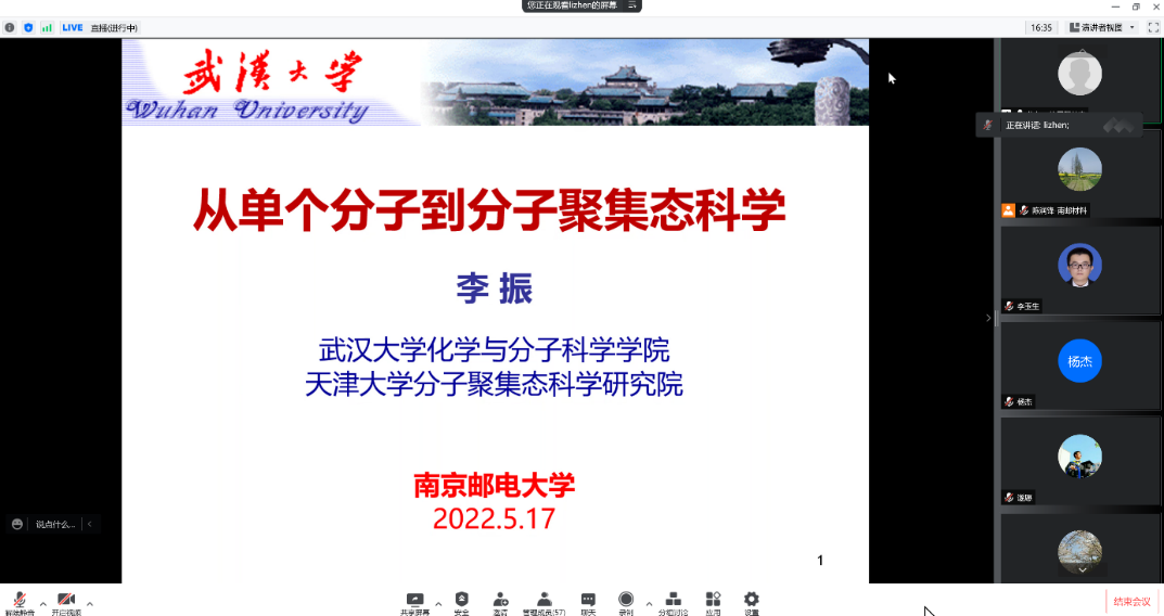 承国脉,薪火相传八十载;创未来,弘毅笃行谱新篇。值此南邮八十华诞校庆学术活动月之际,应腐漫画 和前沿信息技术与产业发展研究中心陈润锋教授邀请,武汉大学/天津大学李振教授于2022年5月17日(周二) 上午10:00(周二)在腾讯会议和腾讯直播上为师生作了以“浅谈从单个分子到分子聚集态科学”为主题的学术报告。陈润锋教授主持了报告,线上共有近100名师生参加。