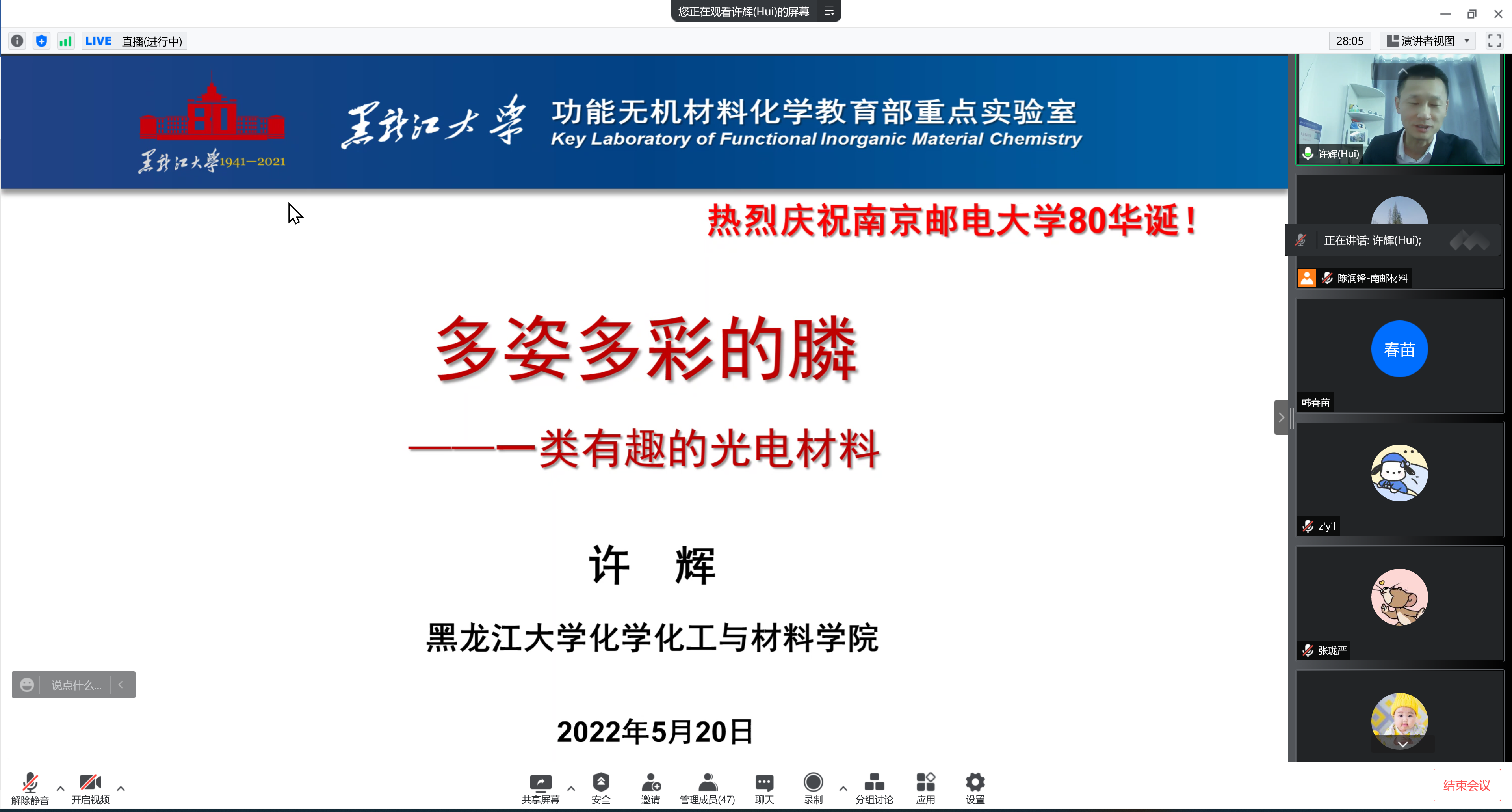 承国脉,薪火相传八十载;创未来,弘毅笃行谱新篇。值此南邮八十华诞校庆学术活动月之际,应腐漫画 陈润锋教授邀请,黑龙江大学许辉教授于2022年5月20日(周五)下午14:00在腾讯会议和腾讯直播上为师生作了以“多姿多彩的膦——一类有趣的光电材料”为主题的学术报告。陈润锋教授主持了报告,线上共有近100名师生参加。
