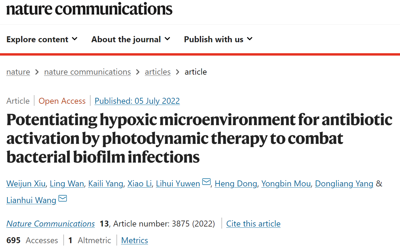 近日,腐漫画 汪联辉教授和宇文力辉副教授团队与南京工业大学杨栋梁副教授、南京大学医学院附属口腔医院牟永斌教授开展合作研究,在细菌生物膜感染治疗领域取得重要进展,提出通过增强乏氧微环境调控细菌代谢并激活药物的新型高效治疗策略。相关成果以Potentiating hypoxic microenvironment for antibiotic activation by photodynamic therapy to combat bacterial biofilm infections为题发表在国际顶级学术期刊Nature Communications(《自然·通讯》)上。
