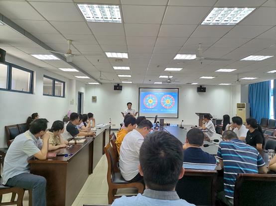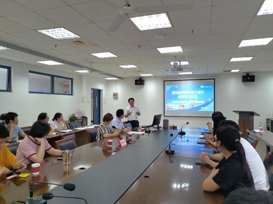 随后,李永涛主任开展了题为《高校教师教学能力提升的探索与实践》的报告。他引用教育部党组书记、部长陈宝生在四川成都召开的新时代全国高等学校本科教育工作会议上的讲话“高教大计、本科为本,本科不牢、地动山摇。人才培养是大学的本质职能,本科教育是大学的根和本,在高等教育中是具有战略地位的教育、是纲举目张的教育”,结合目前分管教师教学发展中心办公室和学业指导中心的情况,从教师培训、课程建设、教学竞赛及基层教学组织四个方面分享经验。在教师培训方面,学校给新入职的青年教师配备从事在教学第一线的导师,进入导师的课堂,进行一对一指导,极大地提升了青年教师的教学水平。在课程建设方面,他指出:建设“金课”就要选出“金种子”,厚植合适的土壤,才能生根发芽,高校的责任就是要精心耕耘“金课”生长的肥沃土壤。在教学竞赛方面,李永涛主任强调以评促培,培评结合,构建“培-评-研-赛”教师培养体系,创设“八位一体”的教师能力培养。在基层教学组织方面,学院积极提升设立特色基层教学组织,建设课程思政教学研究中心。