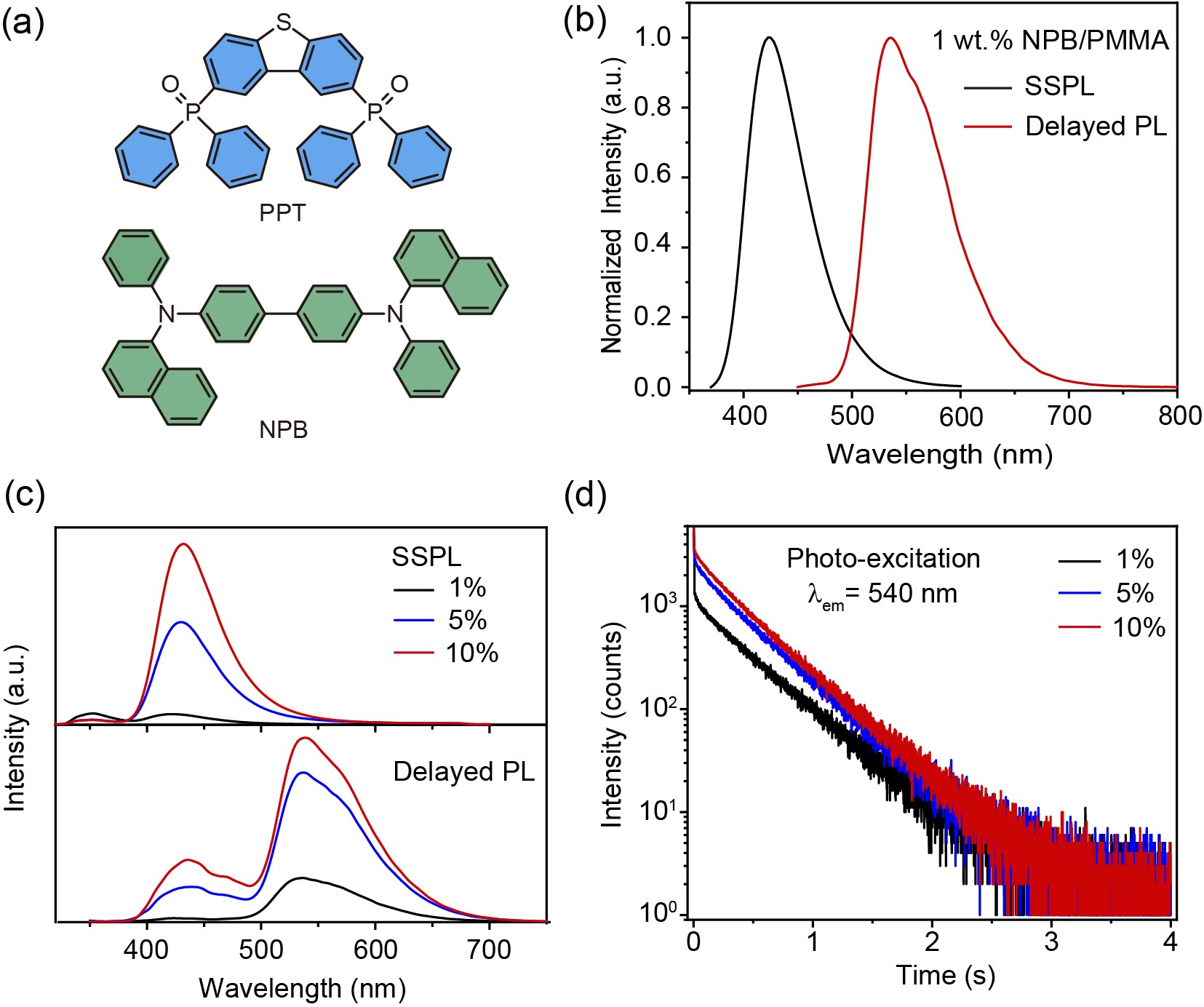 图2: (a) PPT和NPB的化学结构;(b) 掺杂薄膜的荧光和磷光光谱;(c) 稳态(上)、延迟光致发光(下)以及(d)薄膜的瞬态光致发光衰减曲线。