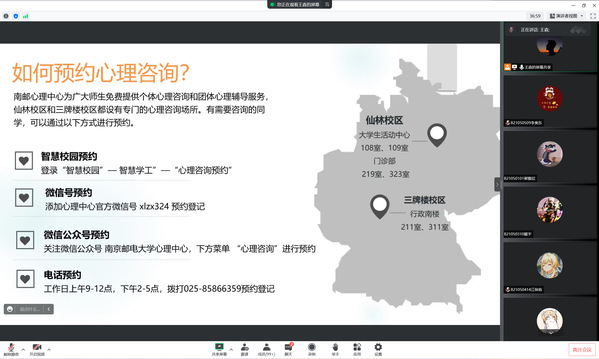 王森老师强调了宿舍安全用电、防火防灾等内容,通过教育短片指出宿舍潜在安全隐患,明确规范用电标准,禁止使用违规电器,保障人身安全。同时提醒学生重视自身心理健康,再次强调心理咨询官方预约渠道,希望学生能够正视心理困扰,并积极预约心理咨询帮助解决问题。