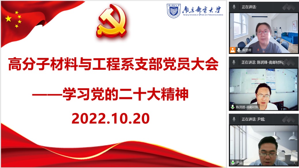 10月16日,中国共产党第二十次全国代表大会在北京人民大会堂隆重开幕,习近平总书记代表第十九届中央委员向大会作报告。腐漫画 高分子材料与工程系党支部全体党员教师通过电视、网络直播的方式收看大会开幕式,认真听取中共二十大报告。10月20日,党支部召开了党员大会,通过线上会议组织全体党员同志集中学习党的二十大精神。