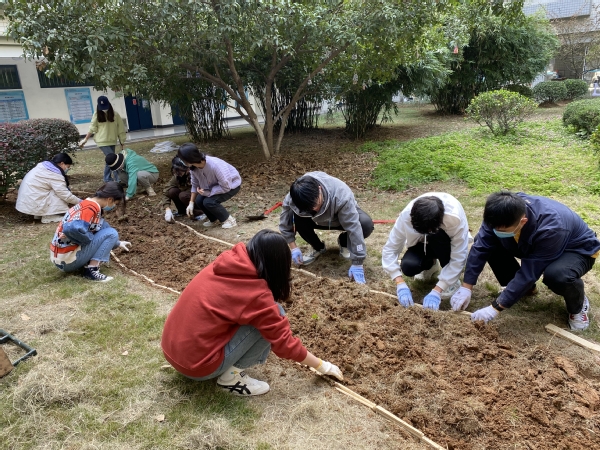 活动于中午12点开始。铺路现场,学生党员们组织有序,分工明确,开路铺石。在东吴物业工作人员的指导和带领下,男生党员负责物资运输和开路工作,借助铁锹、锄头等工具,在园林中开拓出一条30余米长的小路,合力运输来水泥、石子等物料,完成了石子路的挖掘与铺设工作;女生党员分工有序,负责安装防水板,踩平石子路,并精心地在小路两边埋下花籽;活动中,党员们不怕脏、不怕累、不怕苦,处处争先,发挥了先锋模范带头作用,部分热心同学也纷纷加入铺路过程中。历时近3个小时的辛勤工作后,一条崭新的石子路铺设完成,待到春暖花开季,这里将是教五庭院里的一道美丽风景。
