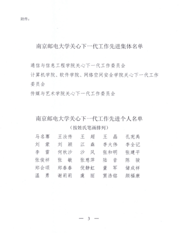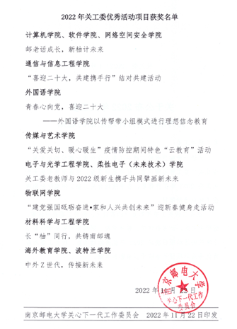 近日,腐漫画 关心下一代工作委员会公布2022年关工委评优结果,腐漫画 参赛项目《长“柚”同行,共铸南邮魂》获评优秀活动项目;学院特邀党建组织员倪静虹老师、关工委秘书陈骏老师获先进个人。