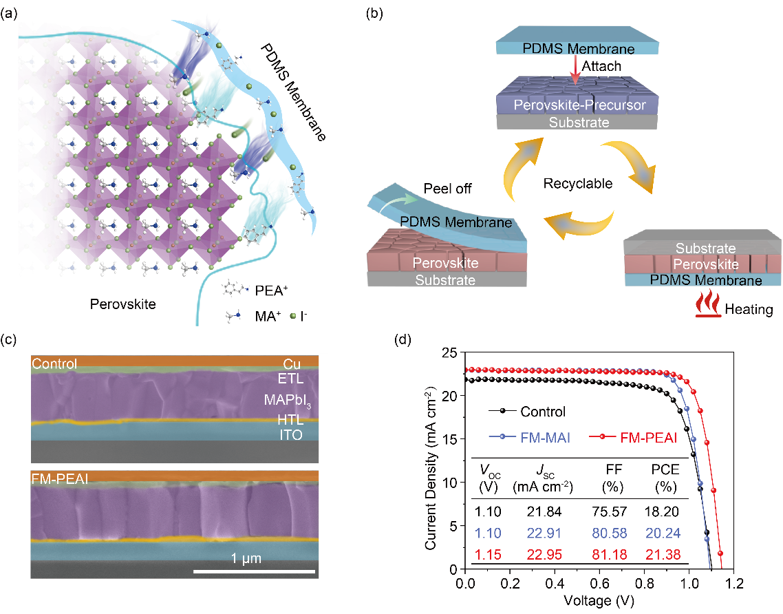 受到多功能护肤面膜滋润人体面部皮肤、深层清洁与改善外观的启发,陈润锋教授与李明光副教授团队围绕钙钛矿薄膜的结晶问题,创新性地开发了一种控制晶体生长的敷面膜工艺(Facial Mask Incubation Technique,图1a),实现了钙钛矿薄膜结晶过程的可控调节。这种钙钛矿面膜由交联性的聚二甲基硅氧烷(PDMS)薄膜和有机卤化物钝化剂组成,且在使用后可回收再利用。在热退火过程中,通过将钙钛矿前驱体薄膜贴附于上述多功能面膜的上表面,构筑起有利于钙钛矿晶体生长的稳定微环境,从而实现钙钛矿结晶过程的原位调控(图1b)。该工艺类似于滋润人体皮肤的面膜,能够长时间作用于钙钛矿薄膜表面,最终制备的钙钛矿薄膜具有光滑的表面形貌、较低的缺陷态密度以及改善的晶面垂直取向(图1c)。与此同时,这一成膜策略能够促使钙钛矿/电子传输层的界面形成更有利于电子提取的n型表面特征。最终,所开发的敷面膜技术成功应用于甲基胺基碘化铅和混合阳离子钙钛矿光伏器件,分别取得了21.4%和20.2%的光电转换效率(图1d),器件的稳定性也得到显著改善。