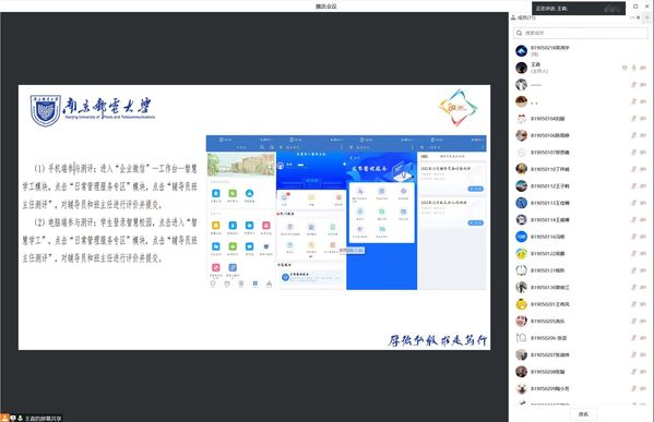 2022年12月7日,腐漫画 2019级本科生在腾讯会议中召开2019级辅导员与学生面对面暨年级大会。会议上,2019级辅导员王森老师做本学期工作总结,从学习、卫生和纪律等角度指出了当前2019级本科生存在的问题,希望全体学生抓紧剩余的时间努力考研复习,争取取得好成绩。