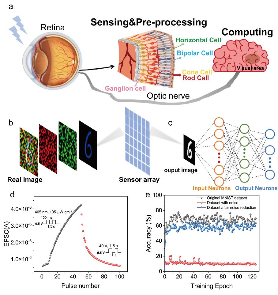 图1:(a)人类视觉系统简要示意图;(b)蓝色特征信息处理过程及(c)图像识别相关的人工神经网络;(d)连续光、电刺激下的兴奋/抑制过程;(e)滤噪处理后的图像识别率。