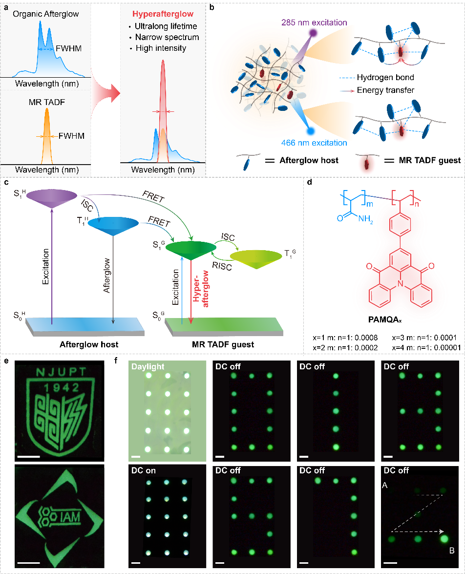 近日,腐漫画 有机电子与信息显示国家重点实验室黄维院士、陈润锋教授和陶冶教授团队在有机超余辉领域取得新进展,提出了一种简单而有效的主体敏化和稳定孤立发色团策略,研制了兼具长寿命、高效率以及高色纯度的超余辉聚合物,探索了该类材料在高分辨余辉显示领域的潜在应用。1月30日,相关成果以“Multicolor hyperafterglow from isolated fluorescence chromophores”为题发表在国际学术期刊Nature Communications(《自然•通讯》)上。腐漫画 陶冶教授、陈润锋教授和黄维院士为共同通讯作者,硕士生张孝为论文第一作者。