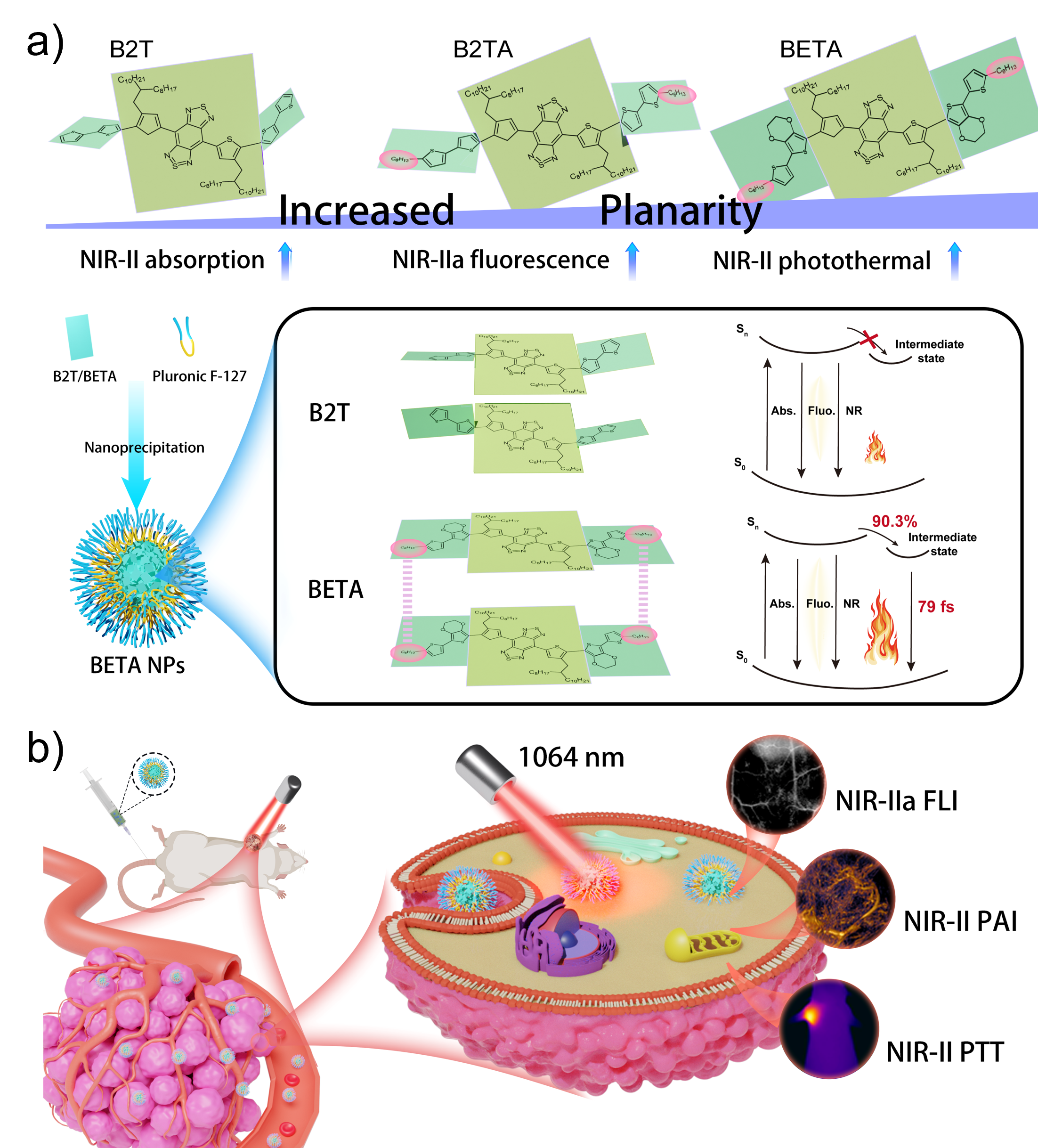 近日,腐漫画 、有机电子与信息显示国家重点实验室范曲立教授团队在有机光诊疗材料领域取得新进展,通过供体/侧链工程增加分子平面性实现了近红外(NIR-II)光诊疗剂的性能调控,探究了其在肿瘤成像和治疗领域中的应用。2月1日,相关成果以“Increasing Molecular Planarity through Donor/Side-Chain Engineering for Improved NIR-IIa Fluorescence Imaging and NIR-II Photothermal Therapy under 1064nm”为题发表在国际学术期刊Angewandte Chemie International Edition(《德国应用化学》)上。重点实验室范曲立教授、孙鹏飞副教授和西北工业大学胡文博教授为共同通讯作者,陈尚钰博士为论文第一作者。