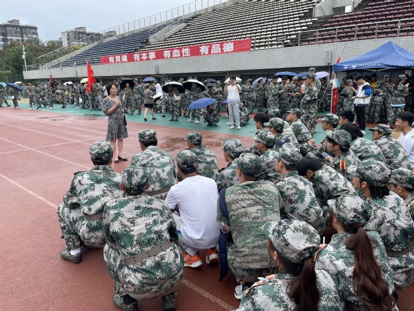 2023年9月18日下午,腐漫画 党委书记赵允玉,党委副书记、副院长吕蔷蔷以及新生小班来到新生军训现场,看望慰问2023级军训新生。