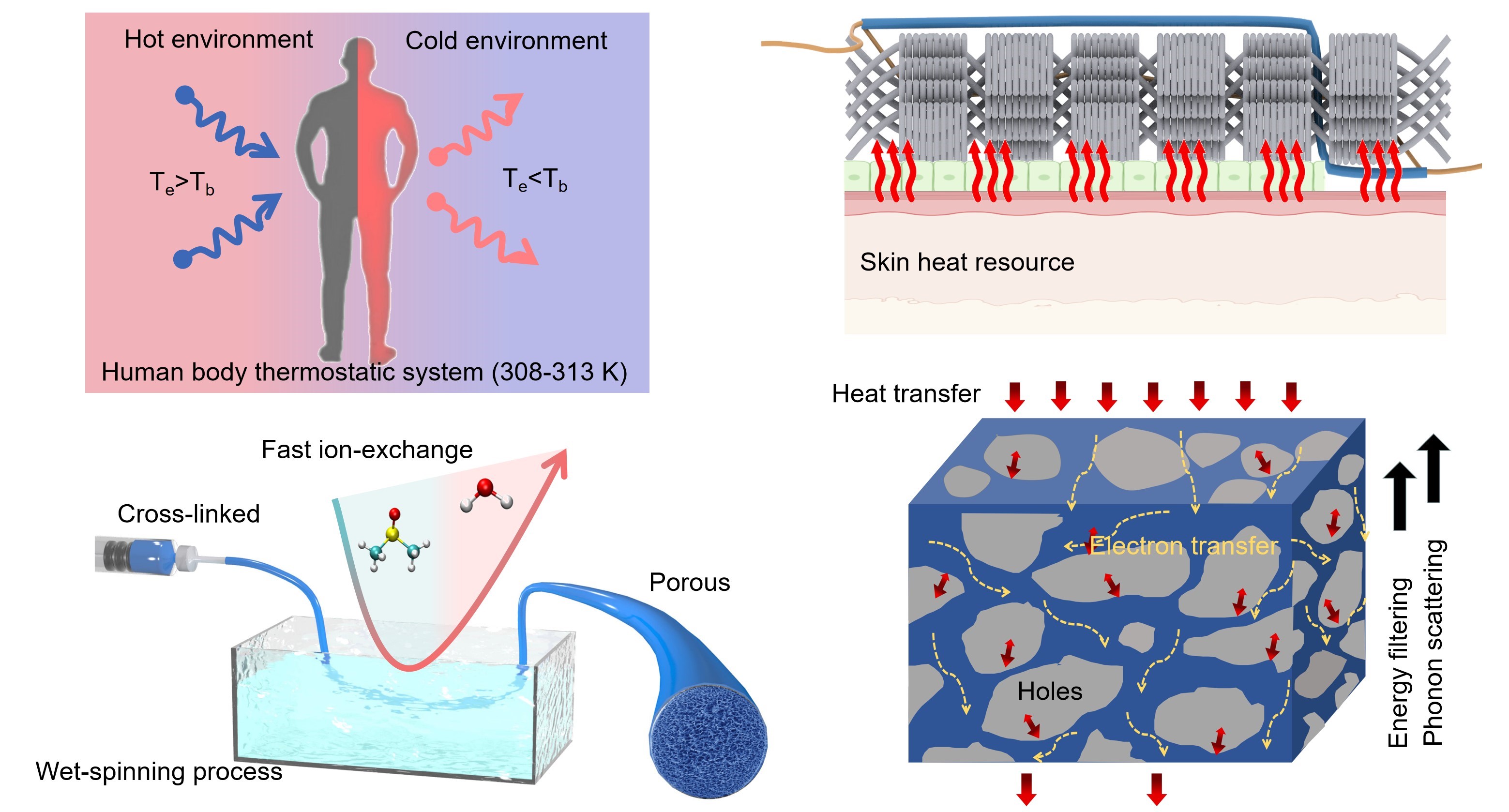 得益于可穿戴生物电子设备的普及,当前的医疗保健系统正从以疾病为中心的反应性模式转变为以预防和促进健康为重点的个性化模式,但用于可穿戴电子生物设备的可持续驱动仍然是一个很大的挑战。人体可连续输出40 mW cm−2的热量,因此与周围环境始终存在5 ~ 40K左右的温差。大量具有研究前景的热电可穿戴设备已经被广泛的应用于绿色能源回收,并且和无处不在的传感器相连。但现有热电纤维大多为p型材料,且材料电导率、塞贝克系数及热导率耦合严重,力学稳定性等方面仍都面临巨大挑战。